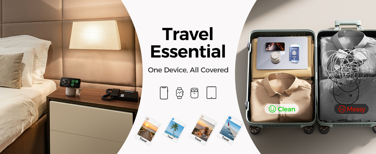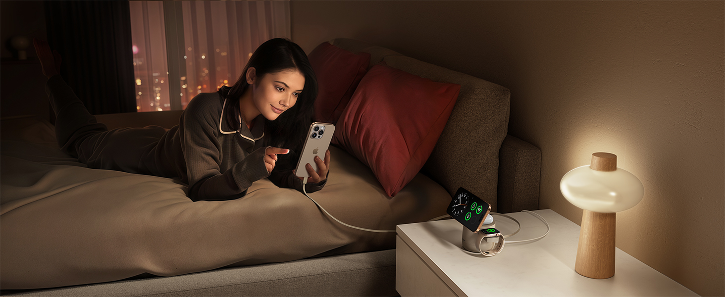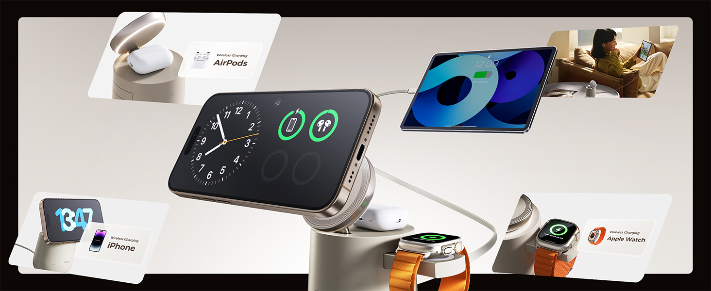 - 【3 in 1 Wireless Charging Station Cube for Your iPhone,iWatch, Airpods and iPad】Upgrades the traditional 3 in 1 wireless charging station by adding an retractable cable cord. A one-stop wireless charging solution for iPhone, iWatch, AirPods, iPad and most Type-C devices. Say goodbye to tangled cords and messy cables, keeping your space neat and your digital life charged with ease.