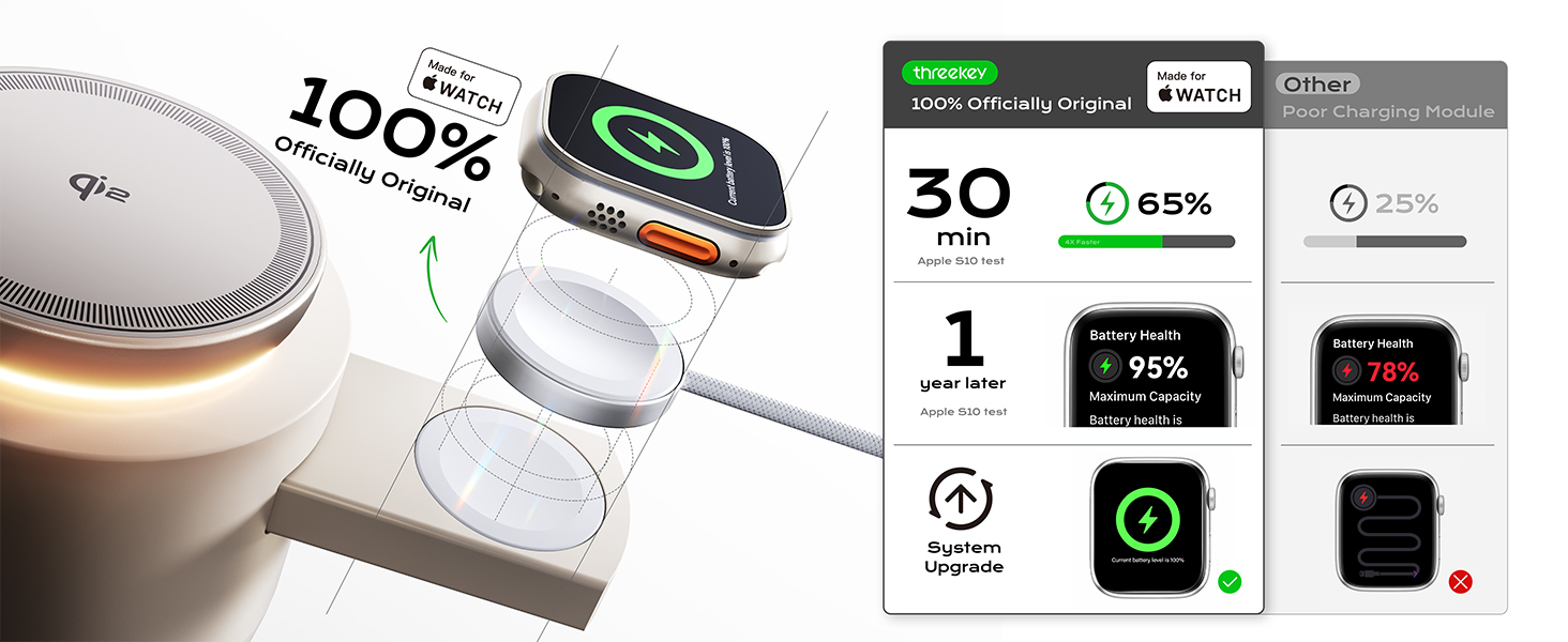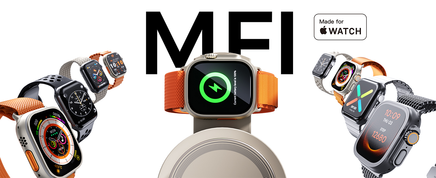 - 【MFI Certified & Made for Apple Watch】Officially authorized by Apple for full compatibility with iPhone 16/15/14/13/12/11/X/8, iPad, and iPods and iWatch. No compatibility warnings – works perfectly with all iOS updates! Built with Apple-authorized chips and premium materials to prevent overheating, short circuits, and damage to your device. Delivers up to 3x faster charging vs. non-certified chargers. Compared to non-MFi cracked versions, it ensures 100% battery health protection and avoids charging issues caused by system updates.Trust the MFi difference!